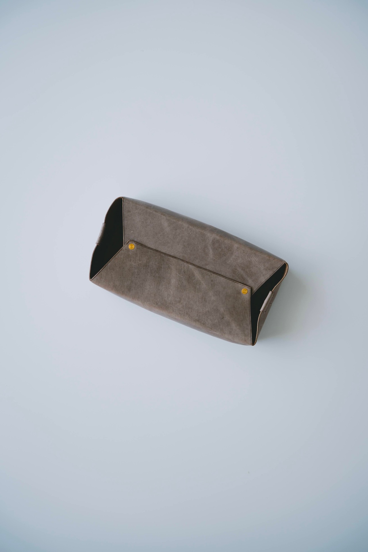 四角いフォルムは、手縫いでしか形づくれない特別な仕立て。ひと針ずつ丁寧に縫い上げ、革ならではの質感と温もりを日常に添えます。